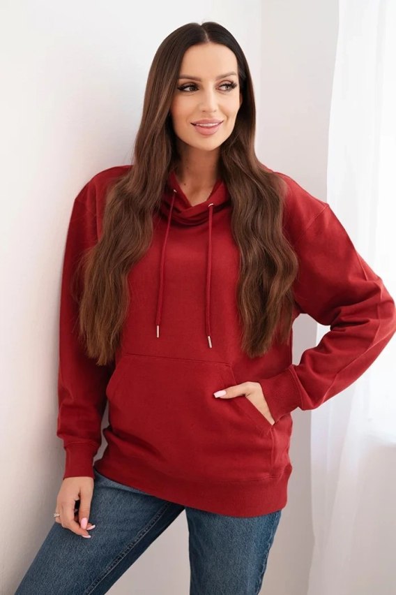 Bluza damska pętelkowa bawełniana z kapturem i kieszenią kangurką bordowa