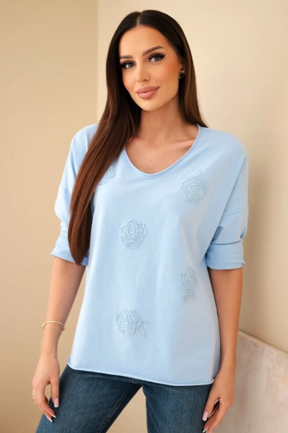 Bluzka damska bawełniana z haftowanymi kwiatami i dekoltem V niebieska