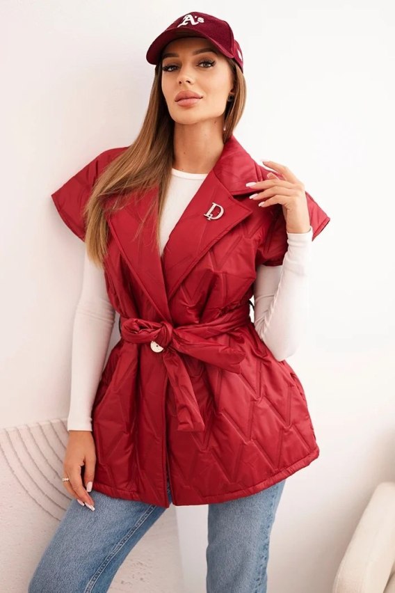 Damska kamizelka pikowana z paskiem i szerokim kołnierzem bordowa