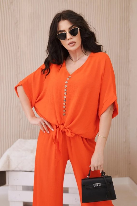 Komplet włoski z bluzką wiązaną z przodu i spodniami z szeroką nogawką to idealny wybór dla kobiet, które cenią sobie wygodę i styl w jednym. Bluzka zawiązywana z przodu na guziki, dodaje subtelnej kobiecości. Spodnie z szeroką nogawką, wykonane z przyjemnego w dotyku materiału, zapewniają swobodę ruchów i wygodę podczas noszenia. Taki kompletny zestaw można nosić na różne okazje - zarówno do pracy, jak i na randki czy spotkania ze znajomymi. Połączony z eleganckimi butami i dodatkami, takimi jak torebka czy biżuteria, stworzy stylową i modną stylizację. Rozmiar jest uniwersalny i będzie odpowiedni dla Pań w rozmiarze S, M lub L.