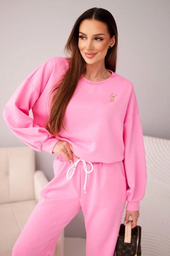 Komplet damski masełko bluza z broszką i spodnie z prostą nogawką jasno różowy