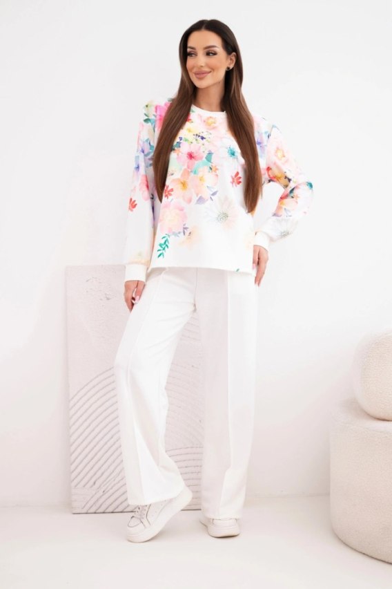 Komplet damski masełkowy wiskozowy w kwiaty z szeroką nogawką biały