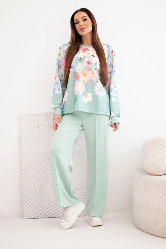 Komplet damski masełkowy wiskozowy w kwiaty z szeroką nogawką ciemno miętowy