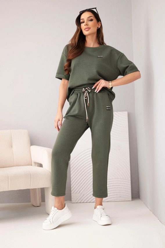 Komplet damski wiskozowy masełko z krótkim rękawem i spodniami z podwijaną nogawką khaki