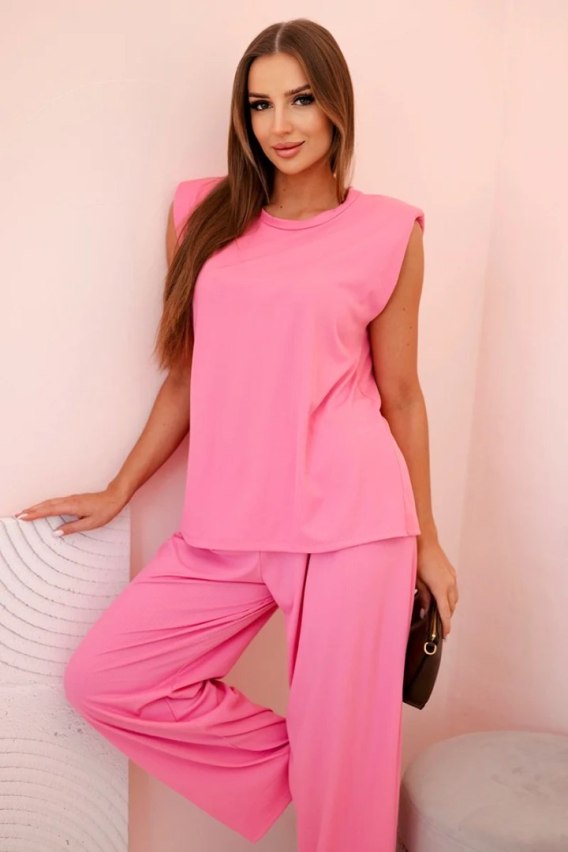 Komplet damski z wiskozy bez rękawów i prostymi spodniami różowy