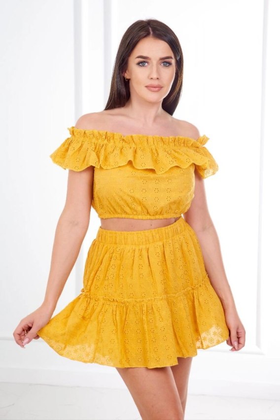 Komplet haftowany z bluzką hiszpanką musztardowy