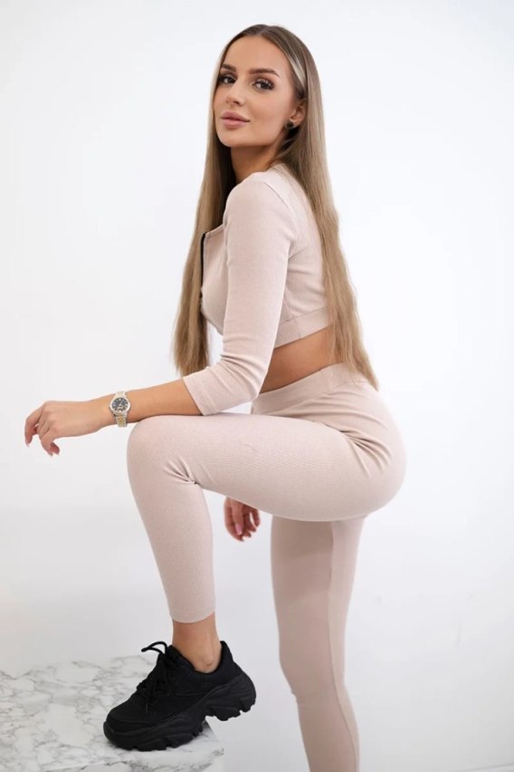 Komplet prążkowany krótki top jasno beżowy