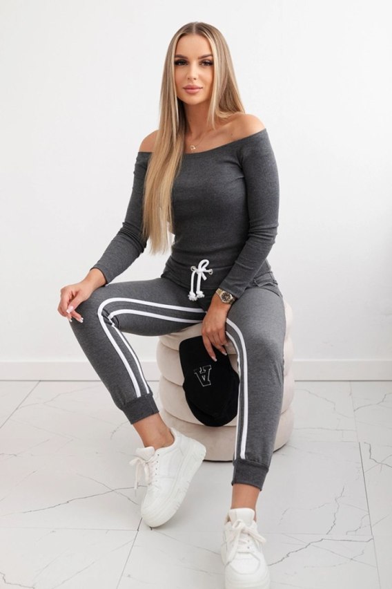Prezentujemy Państwu komplet bluzy i spodni. Komplet posiada spodnie z wyższym stanem. Bluzka z prążkowanego materiału. Na spodniach naszyty podwójny lampas oraz na bluzce. Spodnie posiadają kieszenie. Komplet wykonany jest z wysokiej jakości materiału. Rozmiar jest uniwersalny i będzie odpowiedni dla Pań noszących rozmiar S, M lub L.