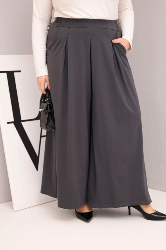 Stylowe i niezwykle wygodne spodnie damskie Plus Size o szerokiej, zwiewnej nogawce to idealna propozycja dla Pań ceniących komfort oraz modny, lekko oversize'owy styl. Dzięki bardzo szerokiemu fasonowi spodnie pięknie układają się podczas ruchu, tworząc efekt spódnicy typu maxi, a elastyczny pas zapewnia doskonałe dopasowanie bez ucisku.