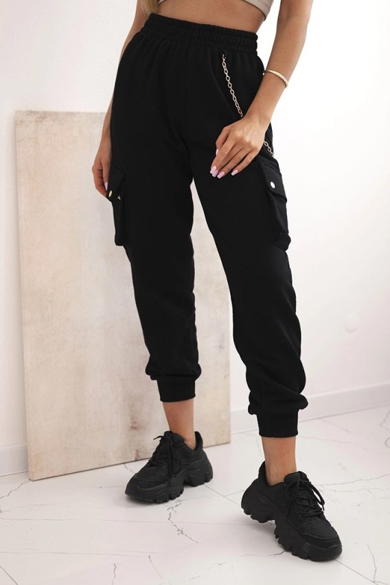 Spodnie damskie bawełniane cargo z kieszeniami i łańcuszkiem czarne