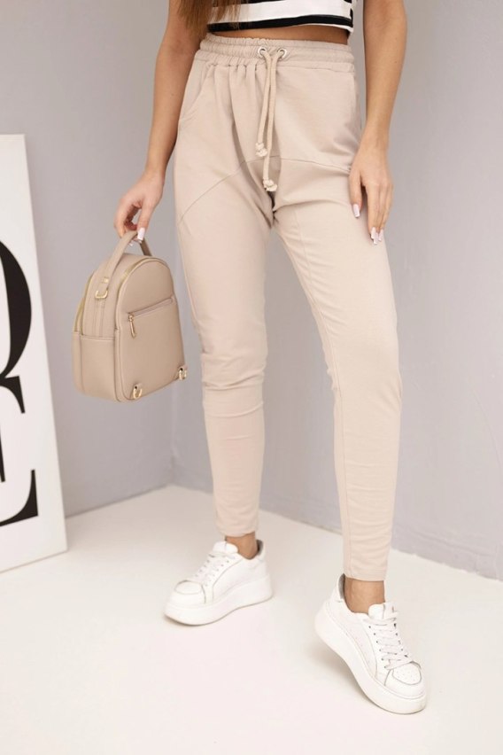 Spodnie damskie dresowe z elastycznym pasem i troczkiem beżowe