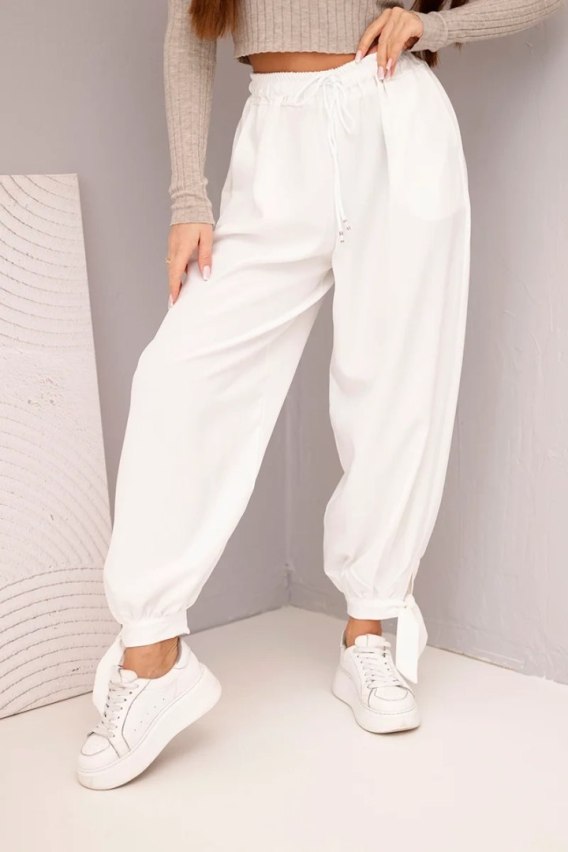 Spodnie damskie z szeroką nogawką i wiązaniem u dołu białe