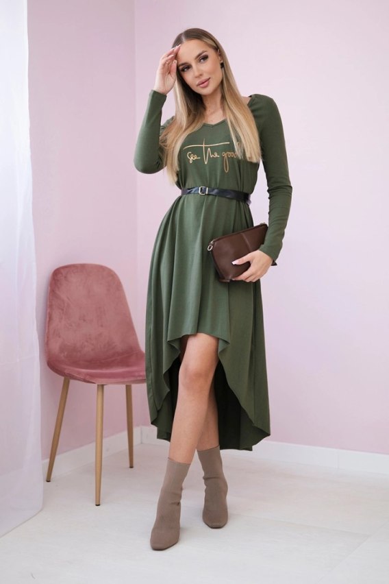 Prezentujemy Państwu wygodną sukienkę z ozdobnym paskiem oraz modnym napisem z przodu. Sukienka posiada dłuższy tył. Sukienka wykonana jest z wysokiej jakości materiału. Bardzo ciekawa propozycja dla wszystkich Pań. Rozmiar jest uniwersalny i będzie odpowiedni dla Pań noszących rozmiar S, M lub L.