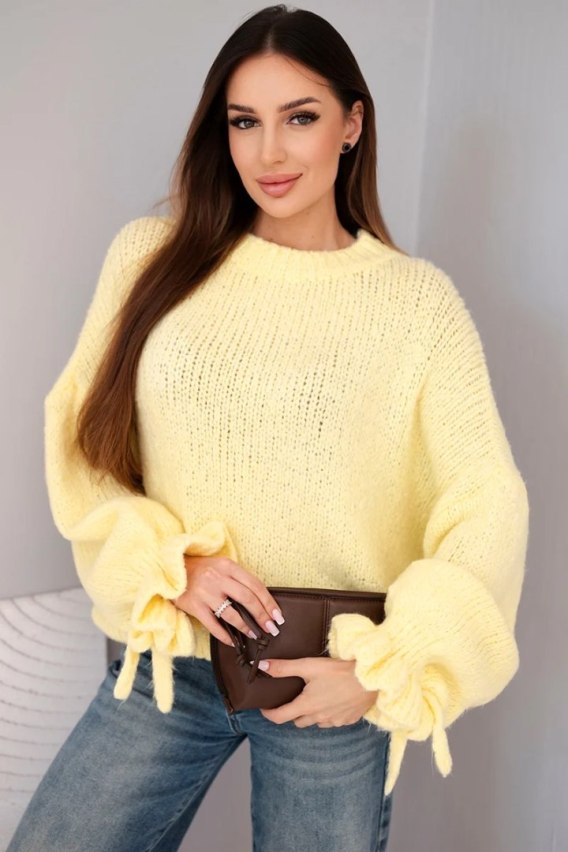 Sweter damski z dodatkiem moheru z grubym splotem i ozdobnymi rękawami żółty