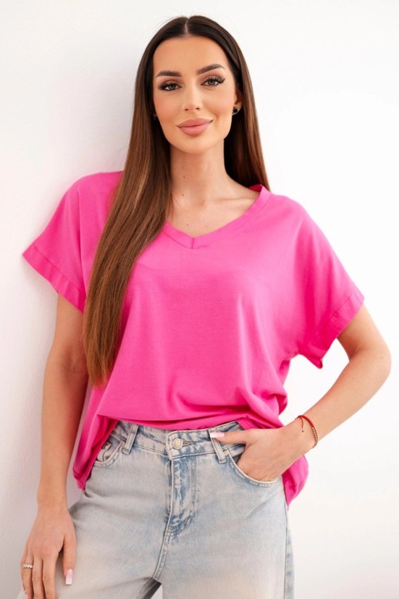 Bluzka damska bawełniana z dekoltem V i krótkim rękawem fuksja