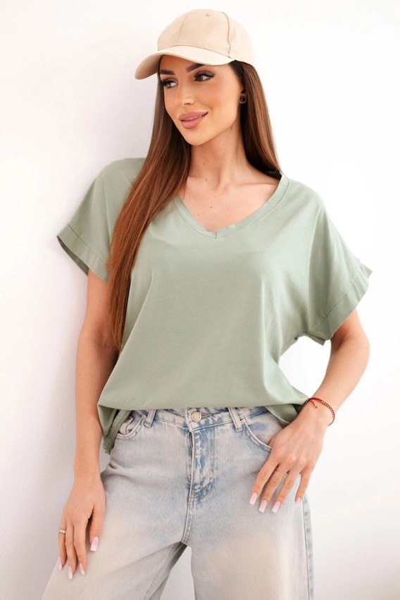 Bluzka damska bawełniana z dekoltem V i krótkim rękawem khaki