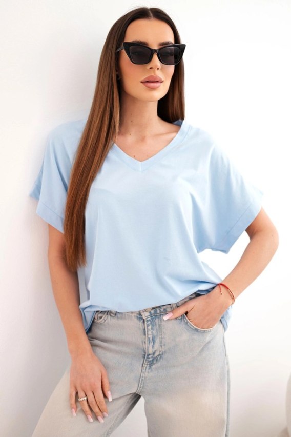 Bluzka damska bawełniana z dekoltem V i krótkim rękawem niebieska