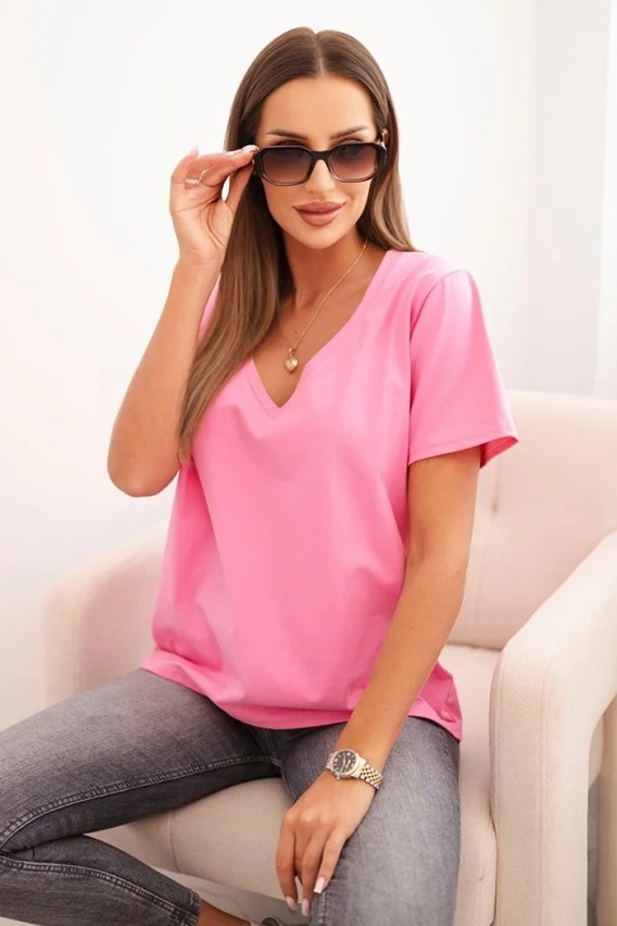 Bluzka damska bawełniana z dekoltem w serek z krótkim rękawem jasno różowa