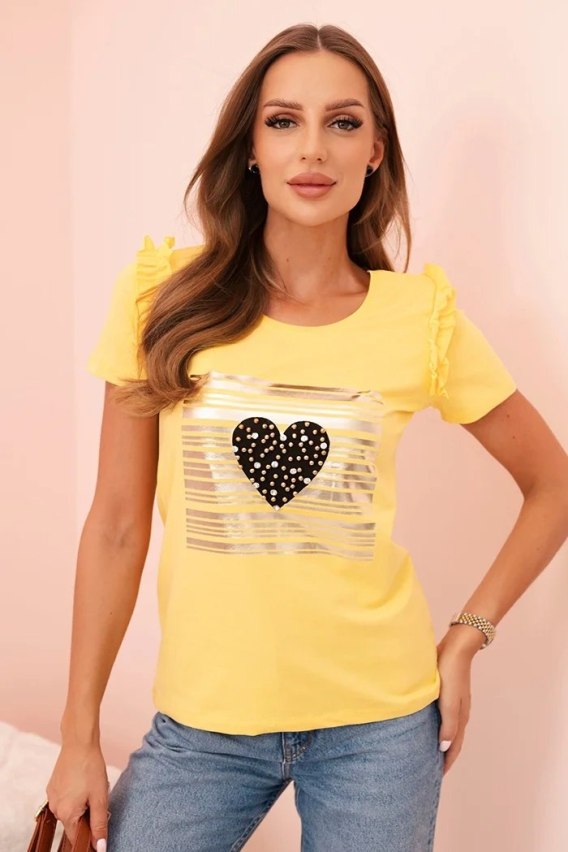 Bluzka damska bawełniana z falbanką i sercem z dżetów żółta