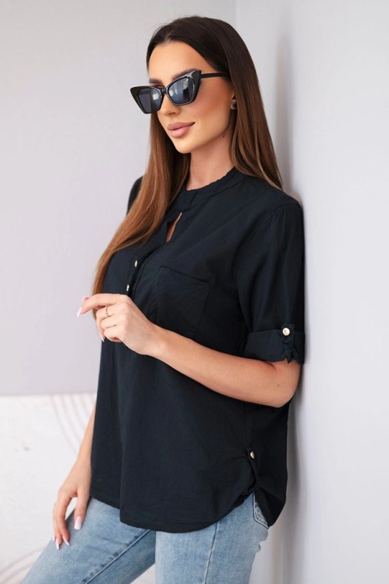 Bluzka damska koszulowa bawełniana z krótkim rękawem i kieszonką czarna