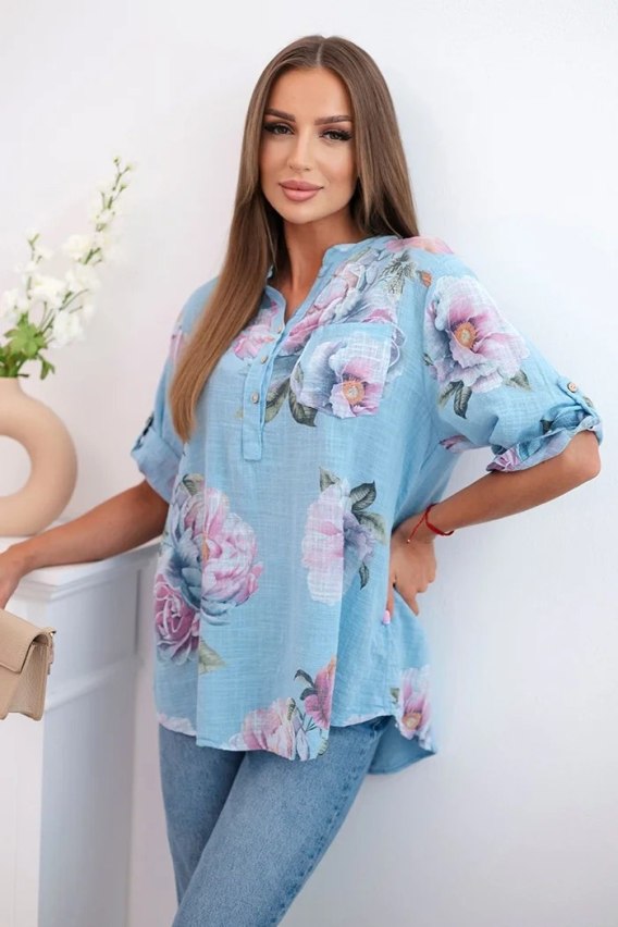 Bluzka damska z bawełny z kwiatowym wzorem niebieska