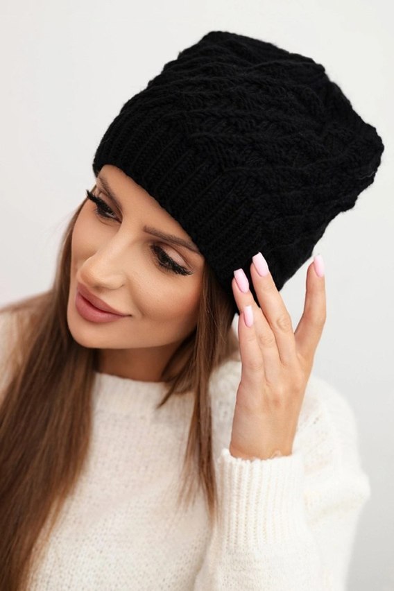 Czapka damska zimowa wełniany z ozdobnym splotem K430 czarna