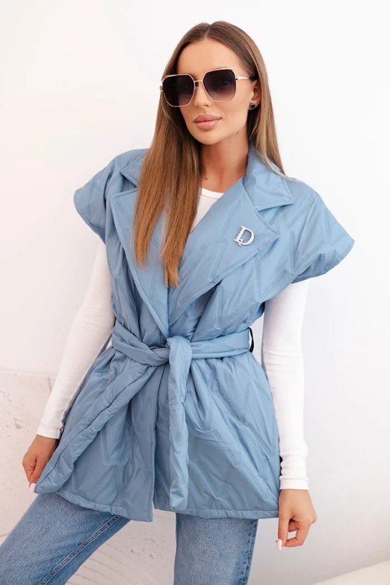 Kamizelka damska pikowana z paskiem i szerokim kołnierzem jeansowa