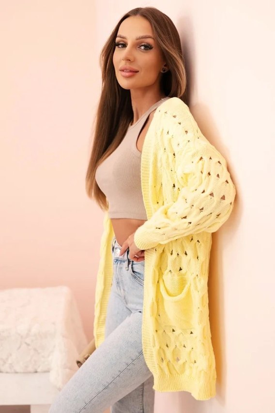 Ten kardigan damski ażurowy to doskonały wybór dla kobiet, które cenią sobie wygodę, styl i oryginalny wygląd. Wykonany z miękkiego, przyjemnego w dotyku materiału, wyróżnia się modnym, ażurowym splotem, który nadaje mu lekkości i kobiecego uroku. Dłuższy fason świetnie komponuje się zarówno z legginsami, jak i dopasowanymi jeansami. Kardigan posiada praktyczne kieszenie z przodu, które dodają mu funkcjonalności, a brak zapięcia podkreśla jego swobodny, casualowy styl. Idealny na chłodniejsze dni wiosną i latem, sprawdzi się również jako stylowy dodatek do biura lub na spacer. Rozmiar jest uniwersalny i będzie odpowiedni dla Pań w rozmiarze S, M lub L.