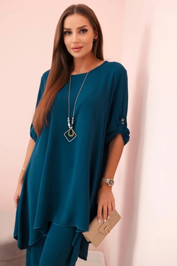 Komplet włoski dwuczęściowy składający się z rozkloszowanej bluzki oraz spodni to elegancki zestaw, który dodaje uroku i stylu każdej stylizacji. Bluzka o rozkloszowanym kroju nadaje subtelnej kobiecości, podkreślając figurę, a jednocześnie zapewniając swobodę ruchów. Klasyczny fason spodni sprawia, że doskonale komponują się z elegancką bluzką, tworząc spójną i stylową całość. Dodatkowo, wisiorek w kształcie klucza stanowi uroczy detal, który dodaje oryginalności i charakteru temu zestawowi, tworząc harmonijną kompozycję. To elegancki dodatek, który podkreśla wyjątkowość i dbałość o detale w całej stylizacji. Taki komplet włoski doskonale nadaje się na wiele okazji, od spotkań biznesowych po romantyczne randki. Jest to wyrafinowana opcja dla osób ceniących sobie elegancję i wygodę w jednym. Rozmiar jest uniwersalny i pasuje dla kobiet noszących rozmiar S, M lub L.