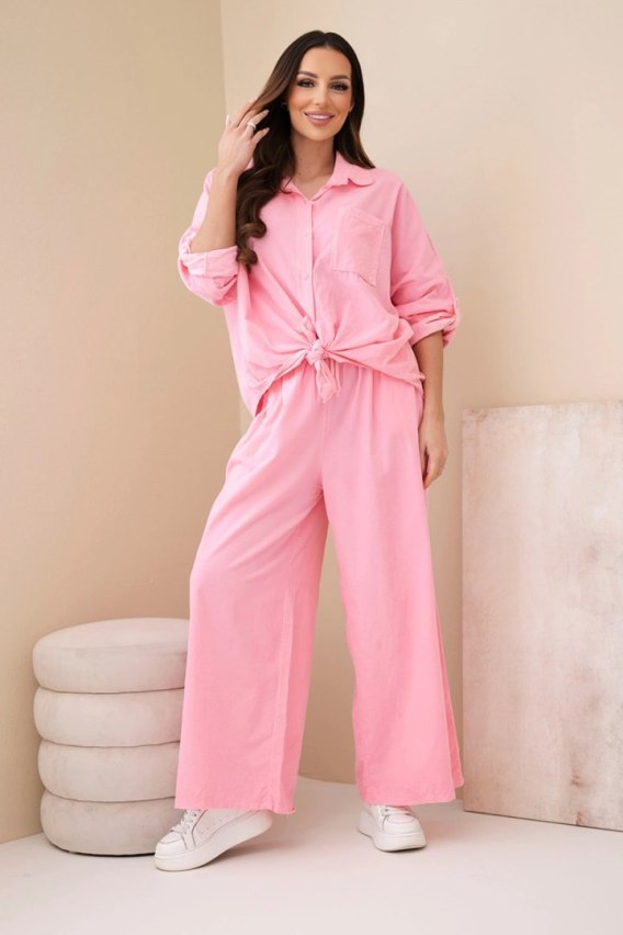 Komplet damski bawełniany z wiązaną koszulą i szeroką nogawką jasno różowy