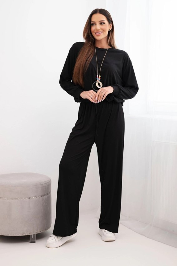 Komplet damski wiskozowy bluza z wisiorkiem i szerokie spodnie czarny