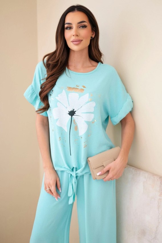 Komplet damski wiskozowy z bluzką z nadrukiem i spodniami miętowy