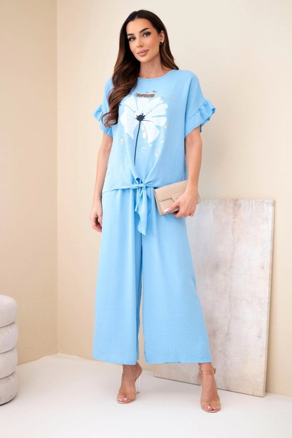 Komplet damski wiskozowy z bluzką z nadrukiem i spodniami niebieski