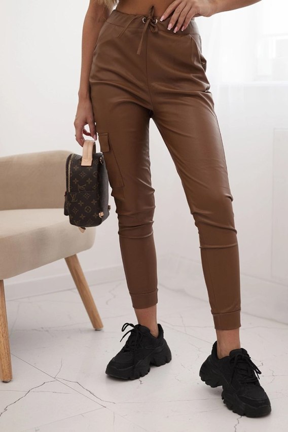 Spodnie damskie z ekoskóry z kieszeniami i wiązaniem w pasie brązowe
