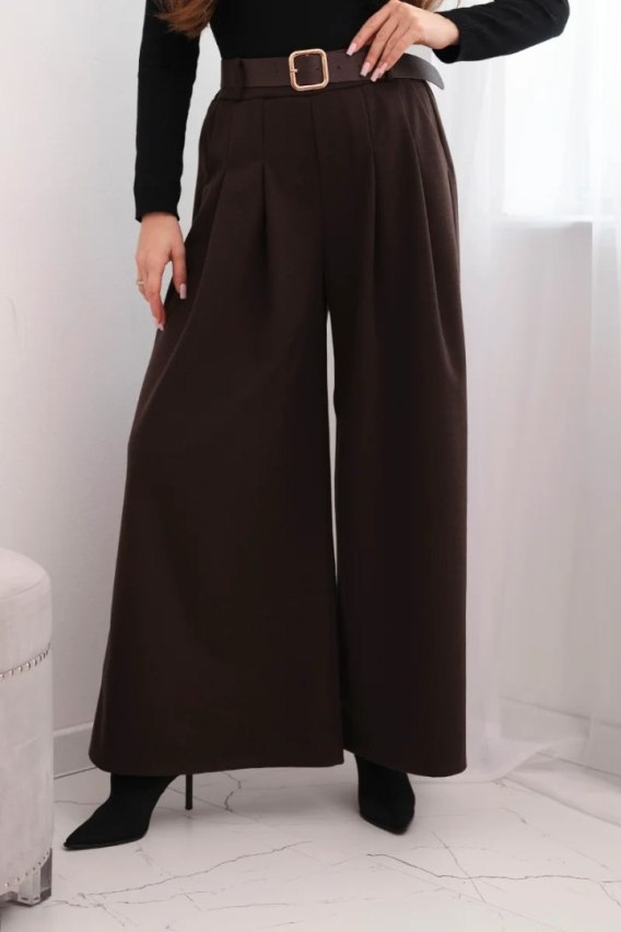 Spodnie damskie z szeroką nogawką i paskiem brązowe