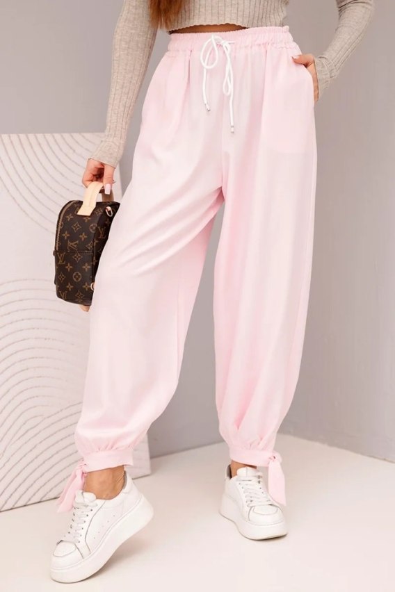 Spodnie damskie z szeroką nogawką i wiązaniem u dołu cukierkowy róż