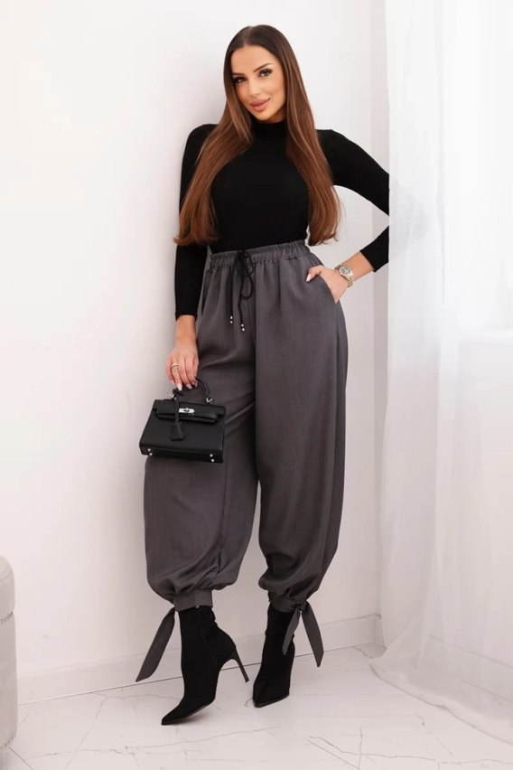 Spodnie damskie z szeroką nogawką i wiązaniem u dołu grafitowe
