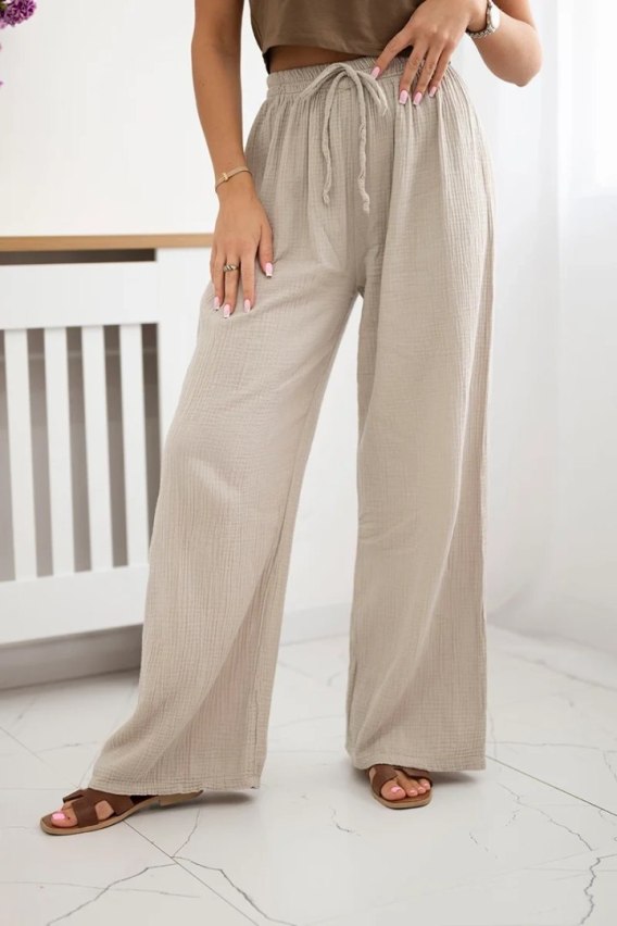 Odkryj wyjątkowe spodnie wykonane z delikatnego, przewiewnego muślinu, które zapewniają niespotykany komfort noszenia nawet w najcieplejsze dni. Ich szeroka nogawka nadaje całości modnego, nowoczesnego charakteru, optycznie wydłużając sylwetkę i dodając stylizacji lekkości. Idealne na co dzień, do pracy czy na wyjątkowe okazje - te spodnie doskonale komponują się z różnorodnymi topami, od minimalistycznych t-shirtów, przez eleganckie bluzki, aż po swetry. Postaw na klasyczny, ale jednocześnie wyrafinowany design, który pozwoli Ci cieszyć się zarówno komfortem, jak i niebanalnym stylem. Rozmiar jest uniwersalny i pasuje dla kobiet noszących rozmiar S, M lub L.