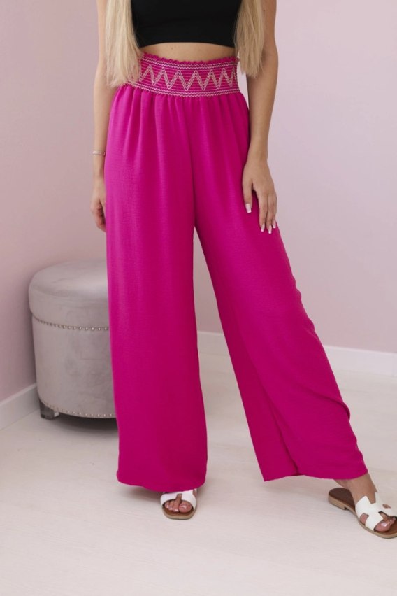Spodnie z szeroką gumą w pasie to praktyczny i wygodny wybór na co dzień. Dzięki szerokiej gumie w pasie zapewniają one doskonałe dopasowanie do figury i komfort noszenia. Idealne na relaksacyjne spacery, domowe obowiązki czy casualowe spotkania z przyjaciółmi. Doskonale łączą wygodę z modnym stylem, a szeroka guma dodaje im oryginalności i lekkości. Te spodnie staną się szybko ulubionym elementem Twojej garderoby, pozwalając Ci cieszyć się komfortem przez cały dzień. Rozmiar jest uniwersalny i będzie odpowiedni dla Pań noszących rozmiar  S, M lub L.