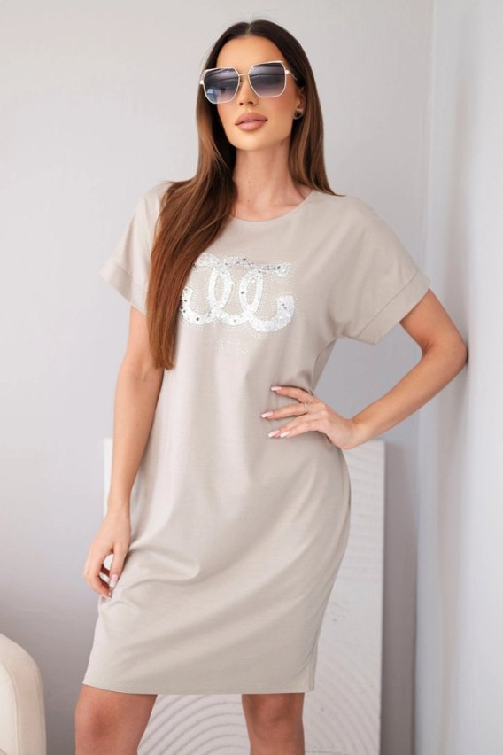 Sukienka damska oversize z krótkim rękawem to modna i wygodna propozycja dla kobiet, które cenią sobie styl oraz komfort w codziennych stylizacjach. Luźny fason sprawia, że sukienka świetnie układa się na sylwetce, zapewniając swobodę ruchów i lekkość noszenia. Ozdobny nadruk z przodu dodaje jej charakteru i przyciąga uwagę, nadając całości nowoczesnego wyglądu.