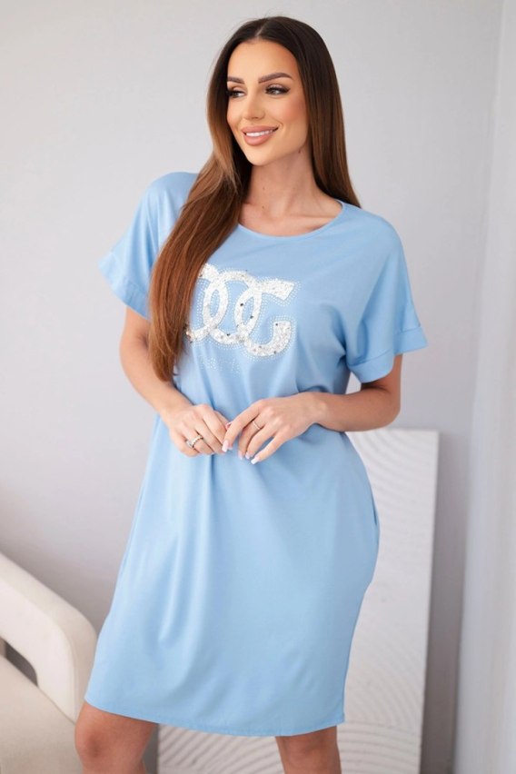 Sukienka damska wiskozowa z krótkim rękawem i ozdobnym nadrukiem niebieska