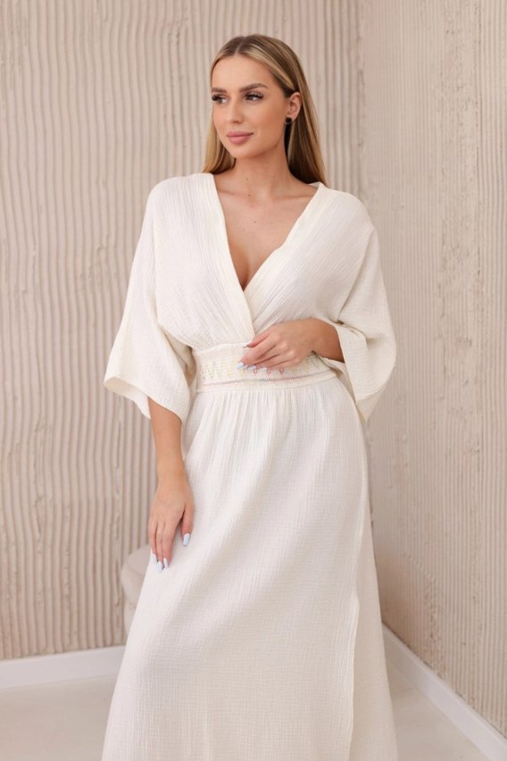 Sukienka muślinowa z haftem w talii jasno beżowa