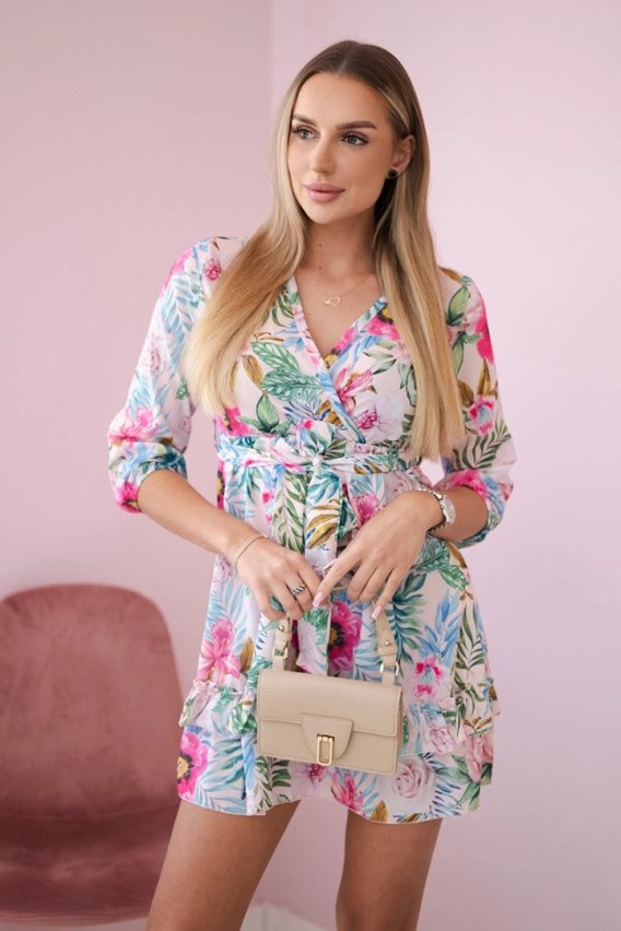 Sukienka w kwiaty wiązana w talii pudrowy róż